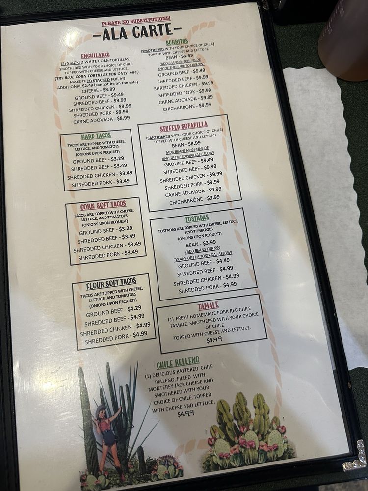 Your choice of ground beef, shredded beef, pork, or chicken or carne adovada, smothered with your choice of red, or green Chile, topped with shredded cheese and lettuce. (1/2 & 1/2)
